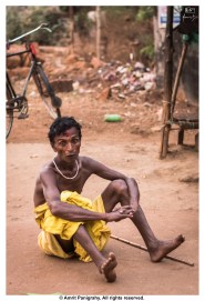 A Dandua sitting on the road exhausted. Lack of sleep and off-schedule, mainly midnight rituals, and just one full meal take a toll even on the most seasoned of them.