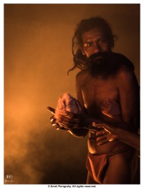 A Mahima monk accepting a coconut being offered by a follower of Mahima Dharma at “Dhuni Mandir”, the temple of fire in Mahimagadi, at Joranda, Dhenkanal, Odisha. The offered coconut will be burned in the holy fire.