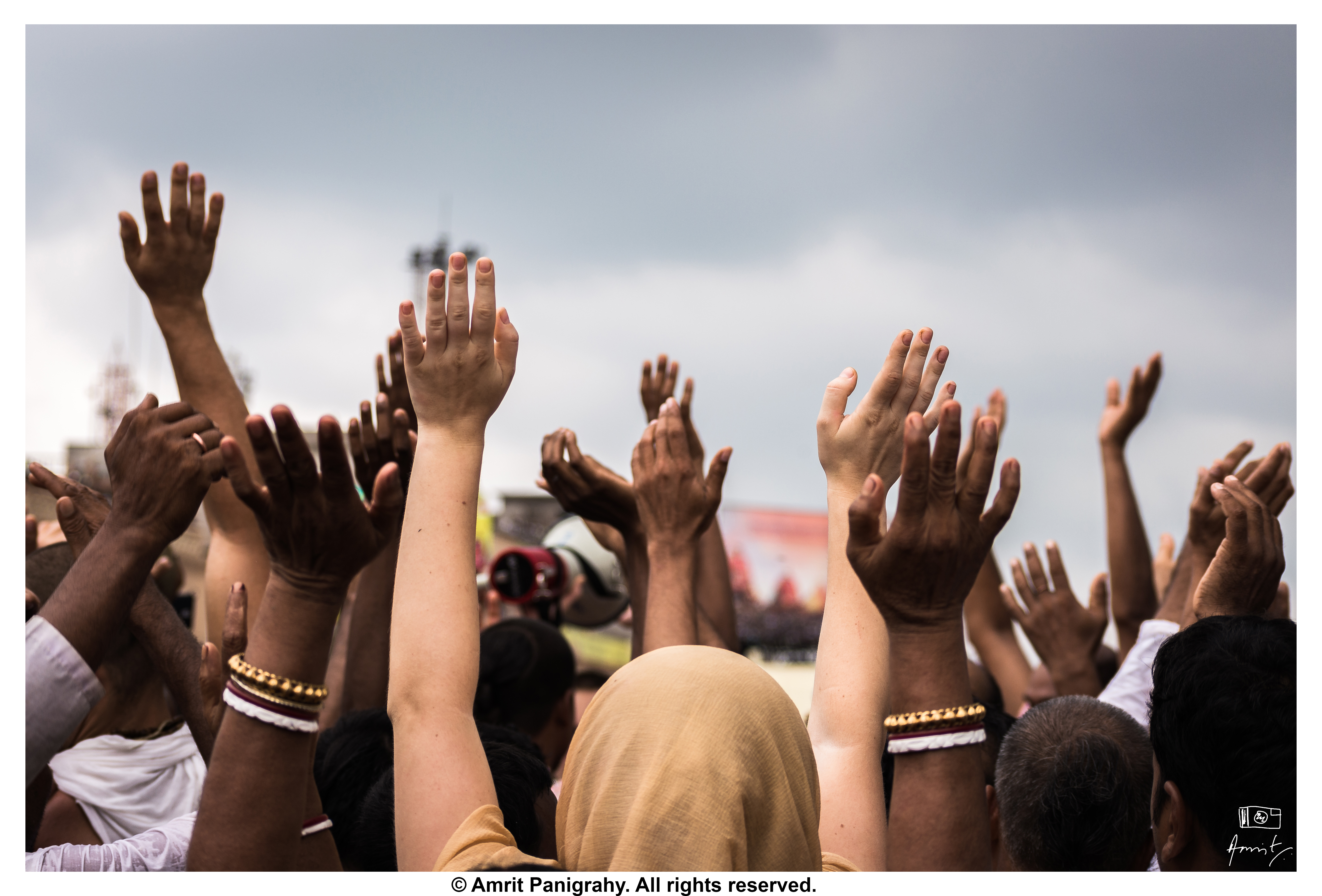 Devotees of Lord Jagannath praying when he appears on his chariot, during Rathyatra. This unique way of praying, extending two arms in the air with open palms symbolizes the devotees urging to Lord Jagannath to rescue them from the figurative mortal sea.